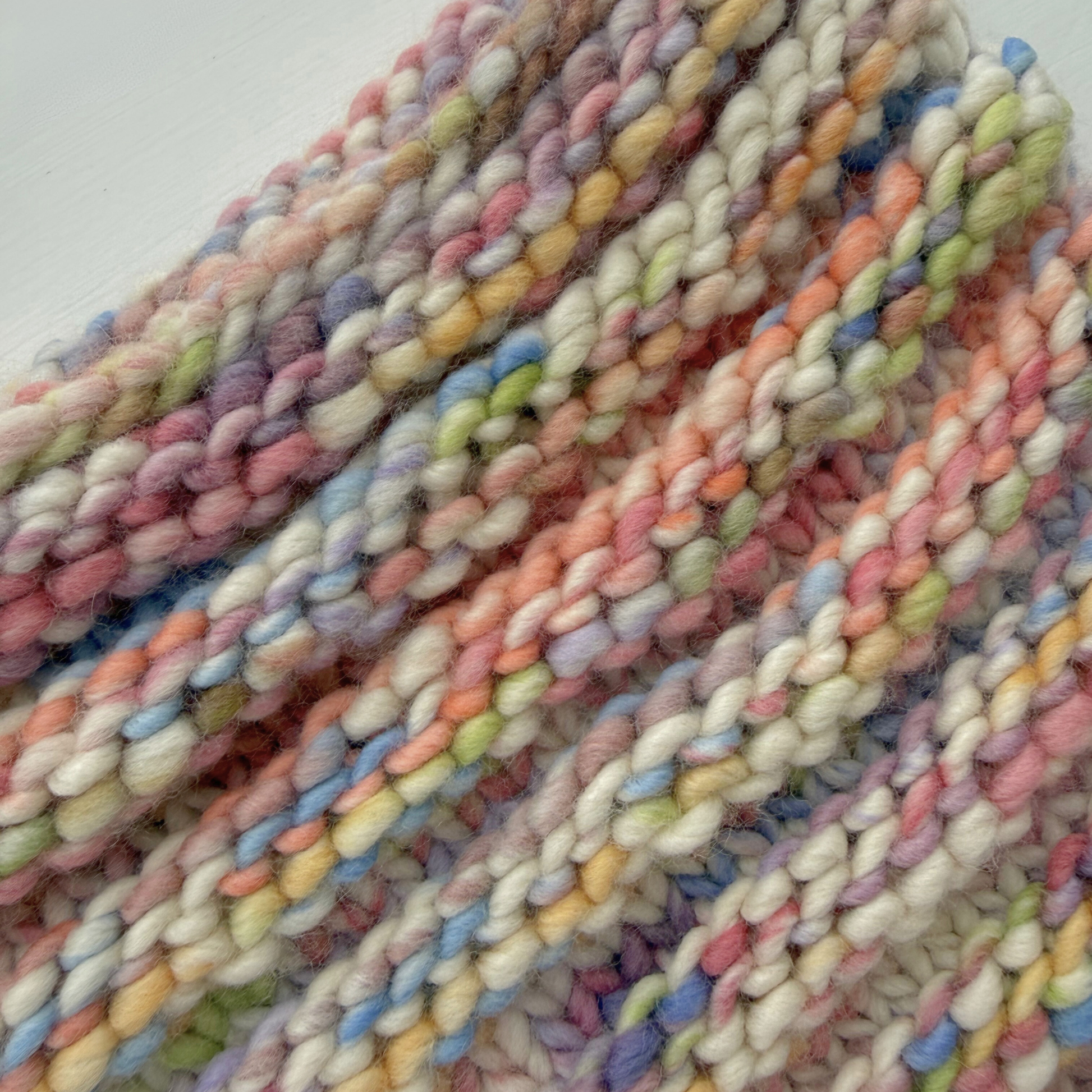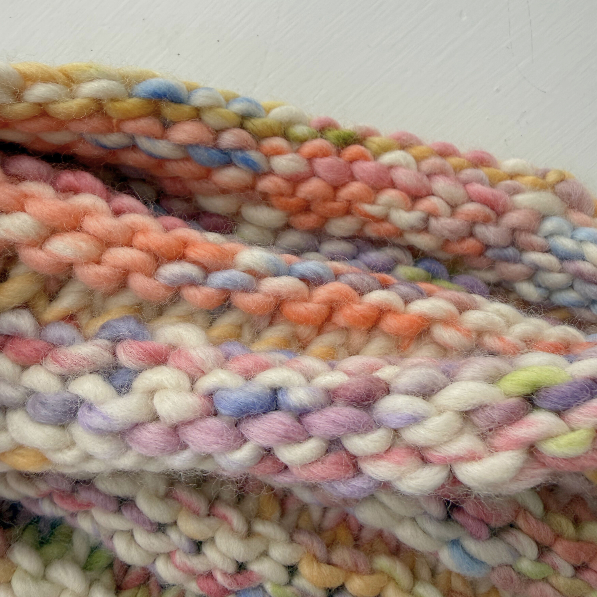 El cuello Arcoíris es una mezcla cálida pintada a mano con una base cremosa combinada con tonos suaves de rosa, lila, azul cielo, amarillo mantequilla y verde pálido, terminada con sutiles motas azul marino, con una variación natural de una pieza a otra.